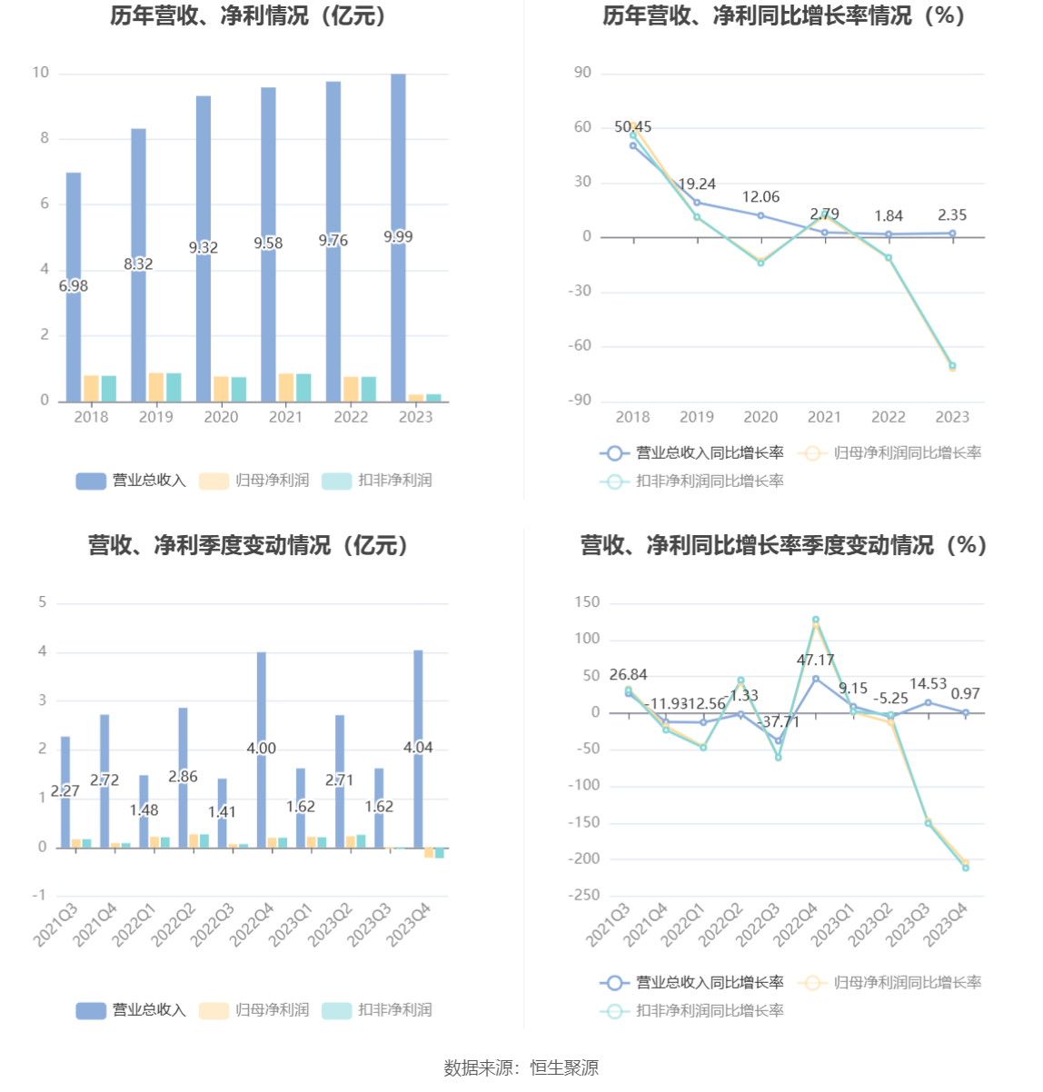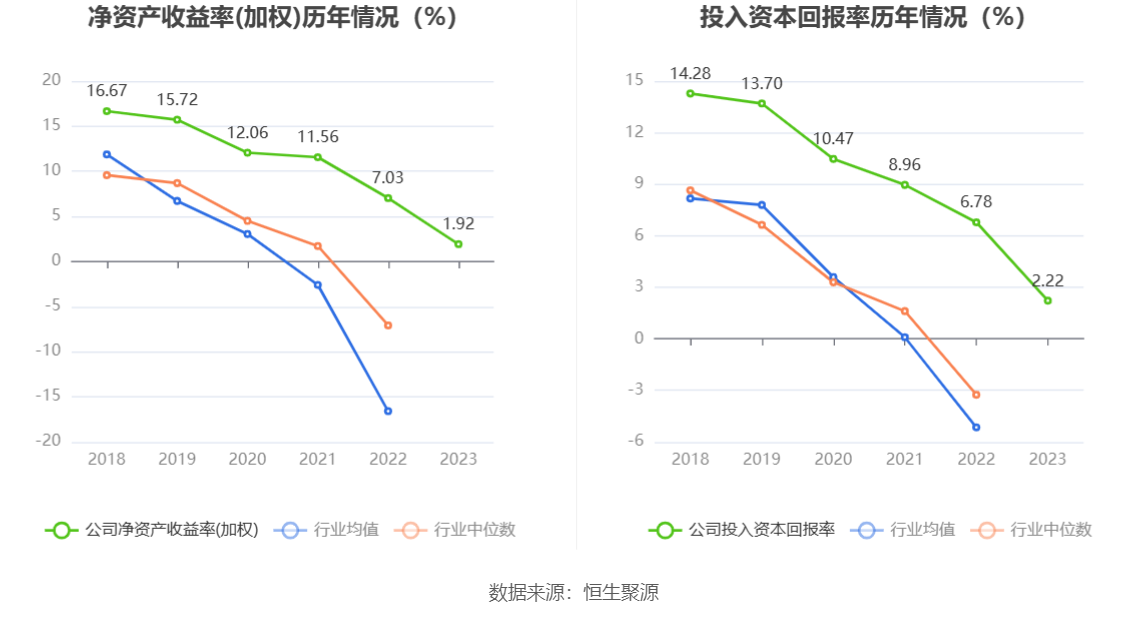 数据显示,2023年公司加权平均净资产收益率为1.92%,较上年同期下降5.11个百分点;公司2023年投入资本回报率为2.22%,较上年同期下降4.56个百分点。