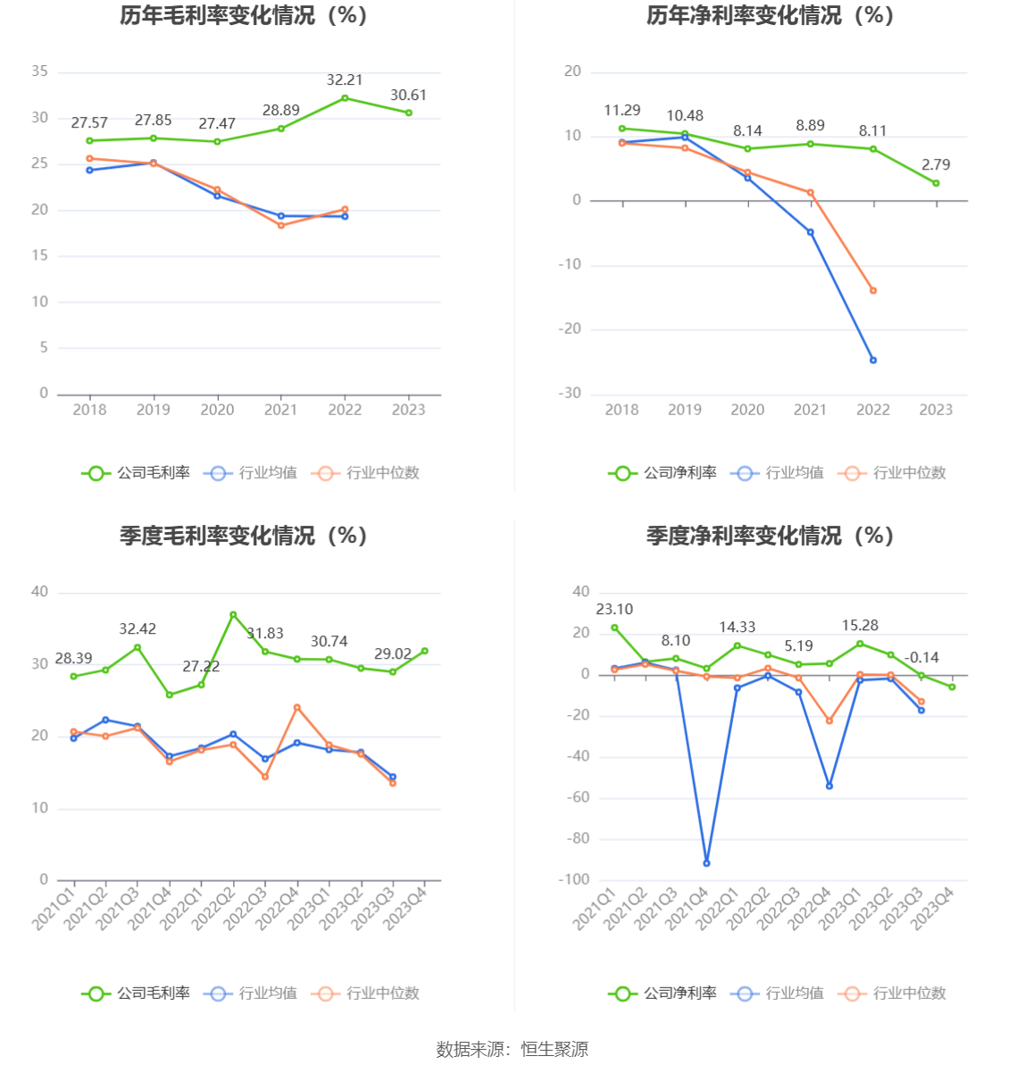 2023年,公司毛利率为30.61%,同比下降1.60个百分点;净利率为2.79%,较上年同期下降5.32个百分点。从单季度指标来看,2023年第四季度公司毛利率为31.93%,同比上升1.14个百分点,环比上升2.91个百分点;净利率为-5.78%,较上年同期下降11.36个百分点,较上一季度下降5.64个百分点。