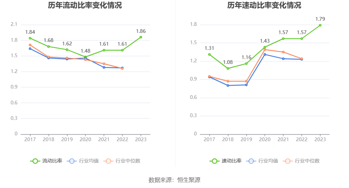 2023年,公司流动比率为1.86,速动比率为1.79。