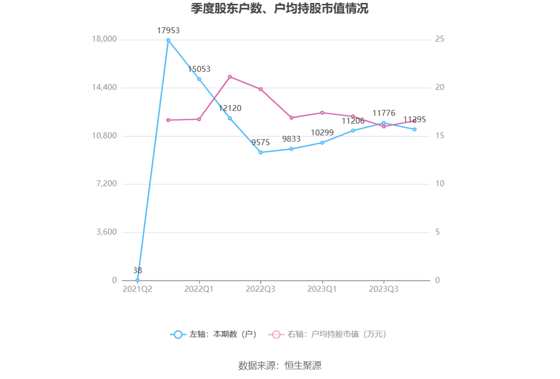 筹码集中度方面,截至2023年年末,公司股东总户数为1.13万户,较三季度末下降了481户,降幅4.08%;户均持股市值由三季度末的15.99万元上升至16.56万元,增幅为3.56%。