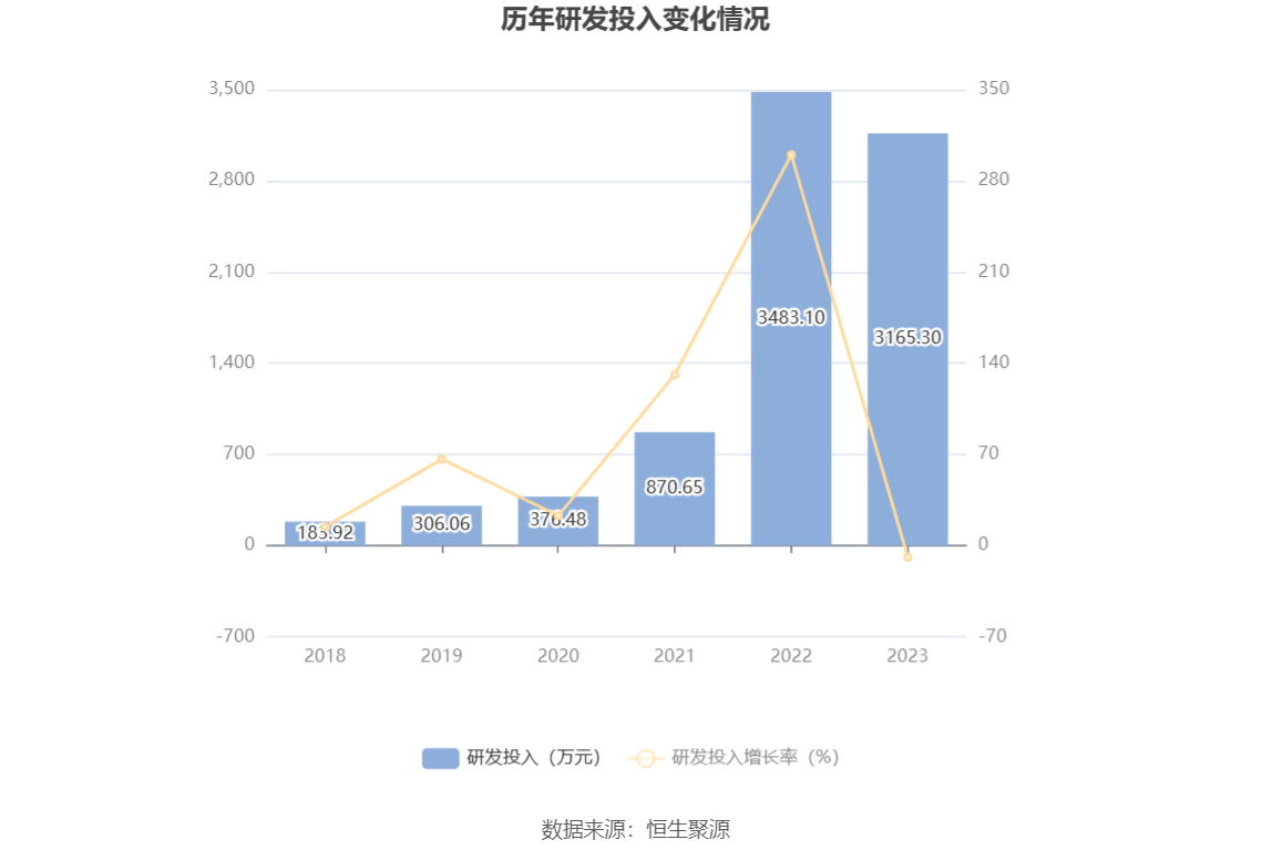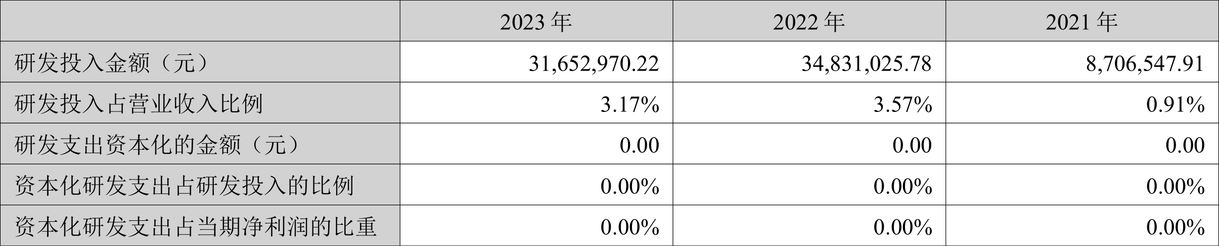 2023年全年,公司研发投入金额为3165.30万元,同比下降9.12%;研发投入占营业收入比例为3.17%,相比上年同期下降0.40个百分点。此外,公司全年研发投入资本化率为0。