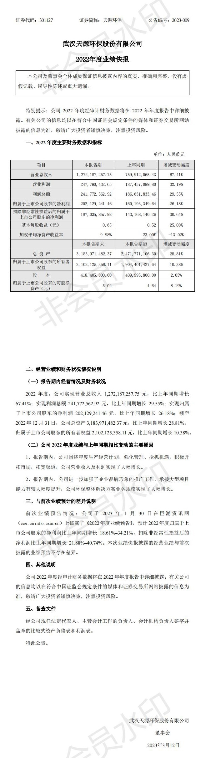 近日,天源环保发布2022年度业绩快报。公告显示,2022 年度,公司实现营业总收入 1,272,187,257.75 元,比上年同期增长67.41%;实现利润总额 241,772,562.92 元,比上年同期增长 29.55%;实现归属于上市公司股东的净利润 202,129,241.46 元,比上年同期增长 26.18%;截至2022 年 12 月 31 日,公司总资产 3,183,971,482.37 元,比上年同期增长 28.81%;归属于上市公司股东的所有者权益 2,102,125,358.11 元,比上年同期增长 10.38%。