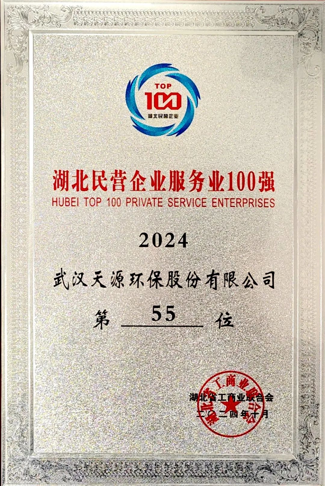 近日,天源环保凭借卓越的服务品质、创新的发展模式以及稳健的经营策略,成功荣获“2024湖北民营企业服务业百强企业”称号。