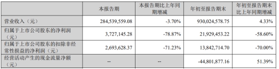 聚赛龙于2022年10月28日披露2022年第三季度报告显示,2022年前三季度,公司实现营业收入930,024,578.75元,同比增长4.33%;归属于上市公司股东的净利润21,929,453.22元,同比下降58.60%;归属于上市公司股东的扣除非经常性损益的净利润13,842,714.70元,同比下降70.00%;经营活动产生的现金流量净额为-44,801,877.16元,同比增长51.39%。