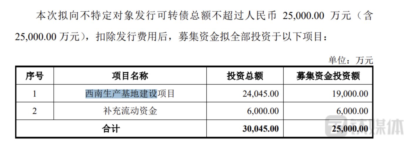 再回至聚赛龙本次融资上,据募集说明书显示,聚赛龙计划发行可转债不超过2.5亿元,其中1.9亿元用于建设西南生产基地建设项目(下称项目一)、6000万元用于补充流动资金。项目一总投资为2.4亿元,项目建设周期24个月,达产后将新增各类改性塑料产能5万吨。