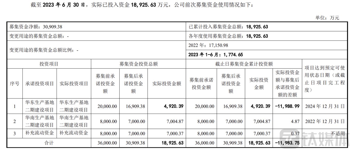 需要说明的是,2022年3月,聚赛龙首发上市,共募资3.59亿元,扣除发行费募集资金净额为3.09亿元,其中2亿元用于建设华东生产基地二期建设项目(下称华东二期项目)、8000万元用于建设华南生产基地二期建设项目(下称华南二期项目),上述两个项目达产后预计将新增各类改性塑料产品产能分别为10万吨、5万吨。