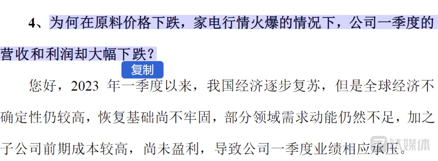 针对上述聚赛龙毛利率和业绩均下滑等问题,深交所在首轮问询函中对公司进行追问。此外,钛媒体APP注意到,在2022年度业绩说明会上,有投资者对此亦提出质疑“为何在原料价格下跌,家电行情火爆的情况下,公司一季度的营收和利润却大幅下跌?”