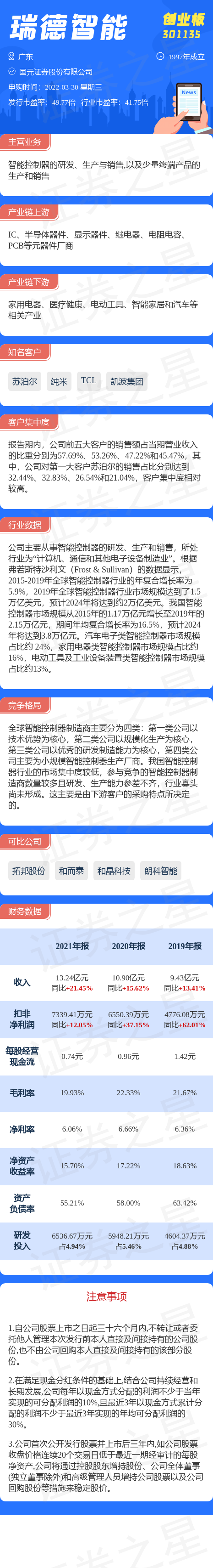 瑞德智能3月30日网上申购,申购代码为301135,中签号公布日期为4月1日。该股概况请见下图: