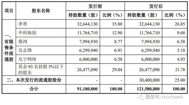 IPO后,李晋直接持股为26.85%,中科海创持股为9.68%,燕鸿持股为6.58%,吴志锋持股为5.18%,凡宁网络持股为4.93%。