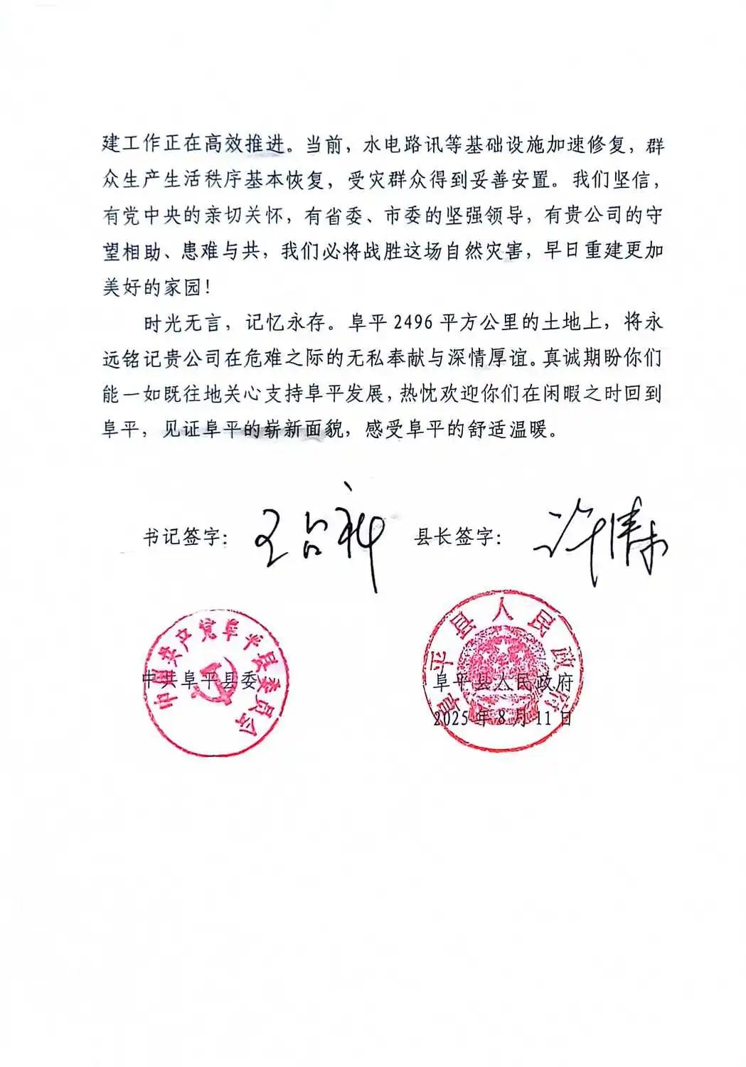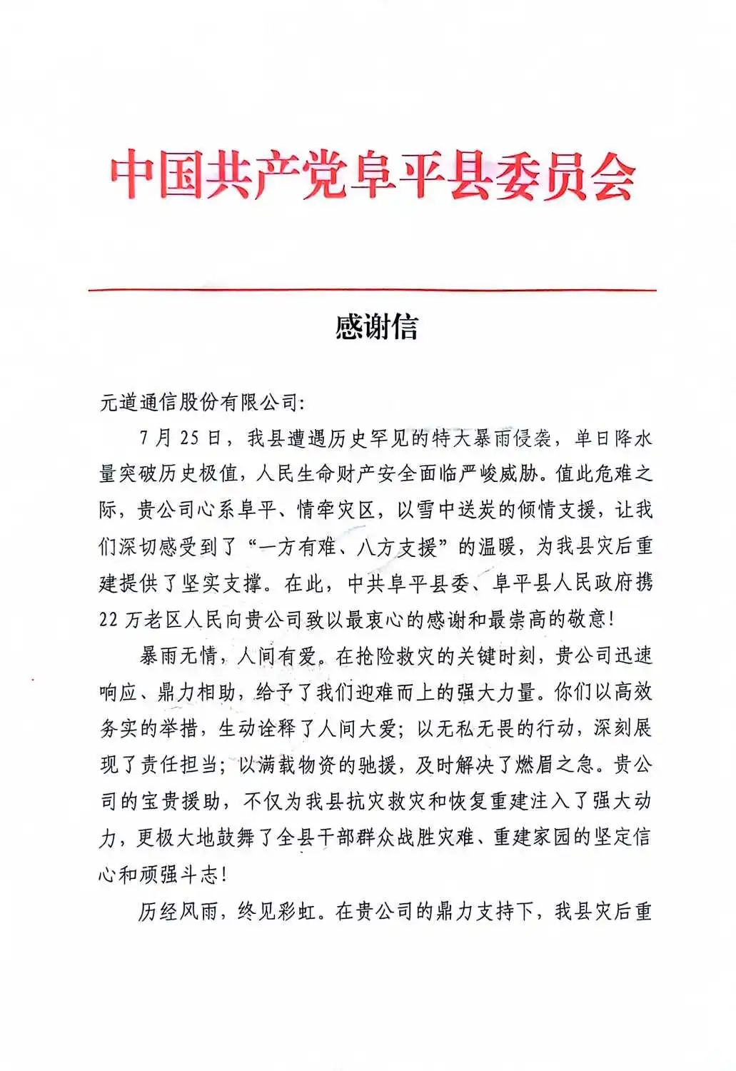 近日,元道通信收到中共阜平县委、阜平县人民政府联合签发的感谢信。信中,中共阜平县委、阜平县人民政府代表全县人民,就公司在当地特大暴雨灾害应急处置及灾后恢复重建工作中提供的紧急支援与鼎力协助表示感谢;同时,对公司的应急救援工作给予高度评价。