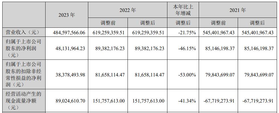 2023年,中科磁业实现营业收入4.85亿元,同比下降21.75%;归属于上市公司股东的净利润4813.20万元,同比下降46.15%;归属于上市公司股东的扣除非经常性损益的净利润3837.85万元,同比下降53.00%;经营活动产生的现金流量净额为8902.46万元,同比下降41.34%。