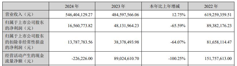 中科磁业(301141.SZ) 2024年年度报告显示,2024年,公司实现营业收入5.46亿元,同比增长12.75%;归属于上市公司股东的净利润1656.08万元,同比下降65.59%;归属于上市公司股东的扣除非经常性损益的净利润1378.78万元,同比下降64.07%;经营活动产生的现金流量净额为-22.62万元,上年同期为8902.46万元。