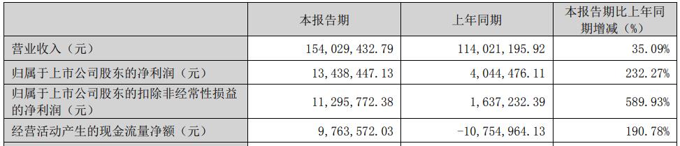 2025年第一季度,中科磁业实现营业收入1.54亿元,同比增长35.09%;归属于上市公司股东的净利润1343.84万元,同比增长232.27%;归属于上市公司股东的扣除非经常性损益的净利润1129.58万元,同比增长589.93%;经营活动产生的现金流量净额为976.36万元,上年同期为-1075.5万元。