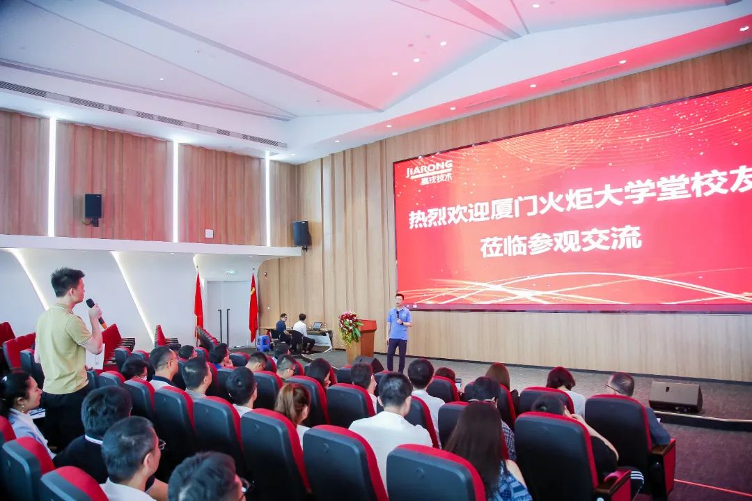 2022年5月28日上午,厦门火炬大学堂校友参访团走进厦门嘉戎技术股份有限公司参观交流,嘉戎技术董事长蒋林煜、常务副总经理学贤等公司领导热情接待并陪同参观。