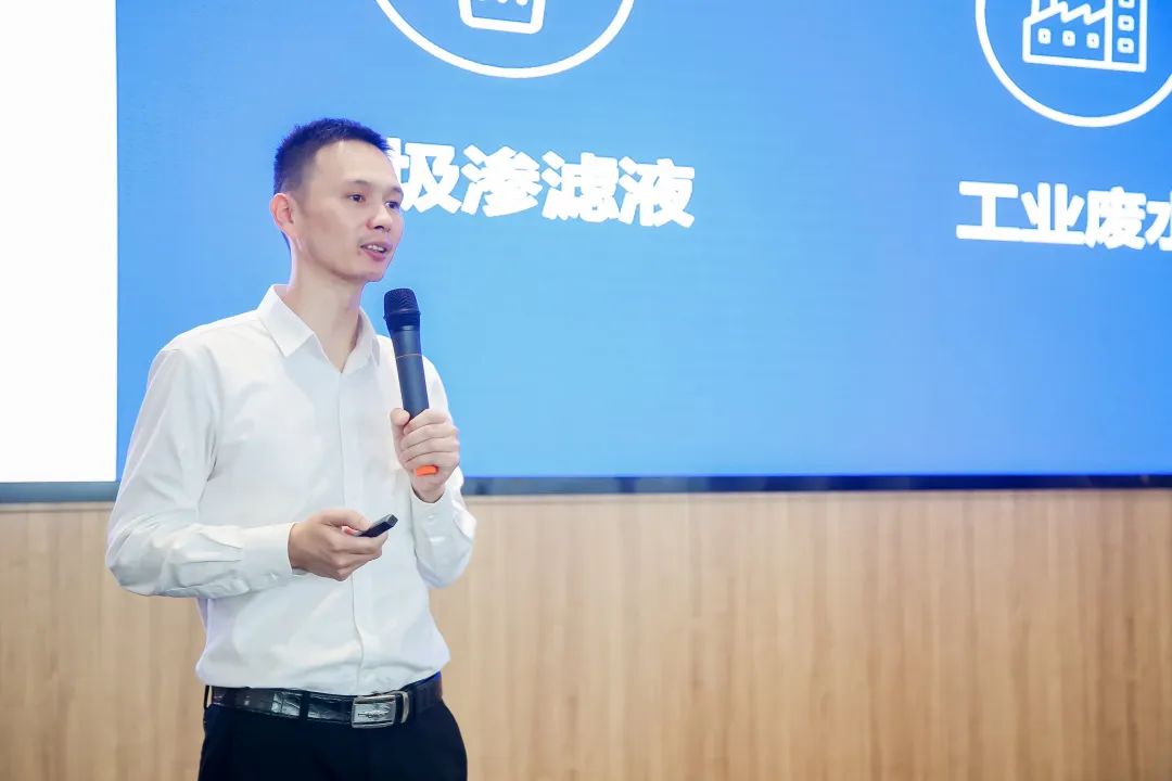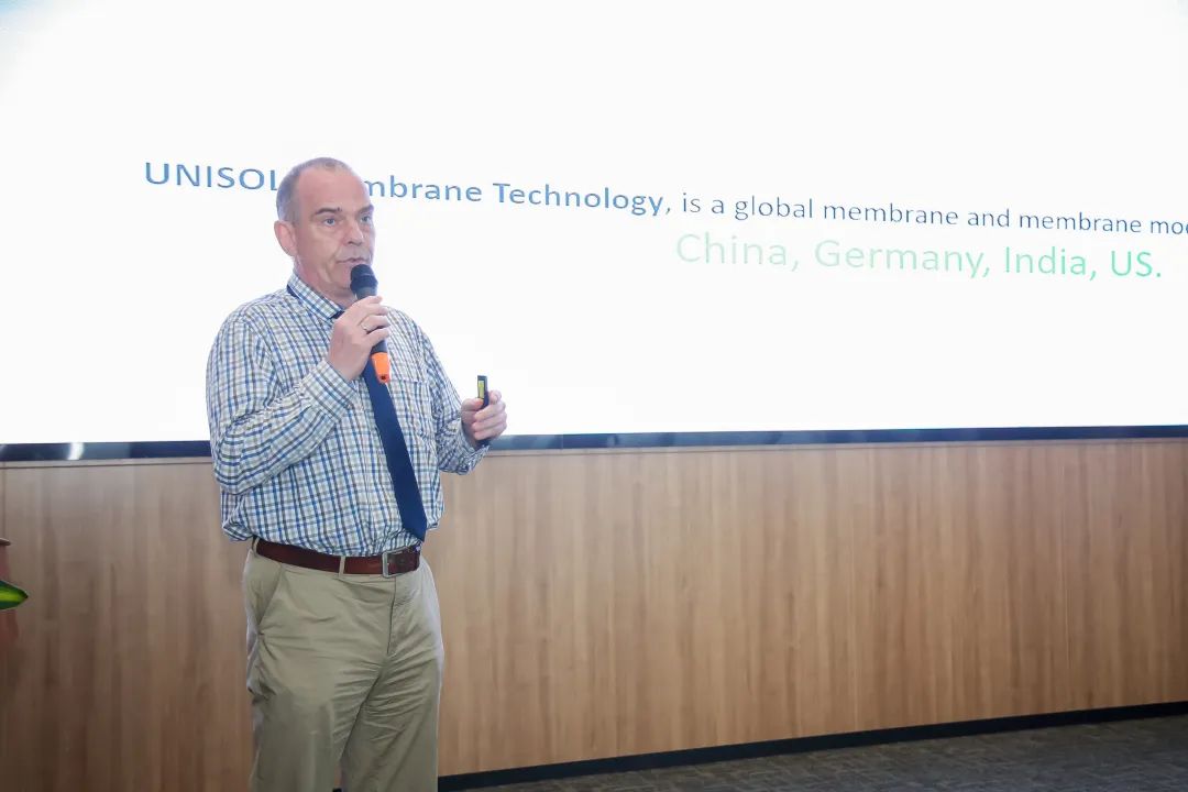 嘉戎技术常务副总经理学贤重点介绍了嘉戎的主要业务和产品、解决了哪些客户痛点和环保难题,分享了重庆长生桥渗滤液全量化处理项目、齐齐哈尔渗滤液全量化处理项目等成功案例。优尼索膜技术公司总经理Hans也向大家介绍了优尼索在全球化方面的发展、业务布局和展望。