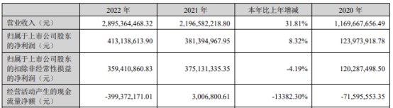 昨日晚间,中一科技发布了2022年年度报告。2022年,公司实现营业收入28.95亿元,同比增长31.81%;归属于上市公司股东的净利润4.13亿元,同比增长8.32%;归属于上市公司股东的扣除非经常性损益的净利润3.59亿元,同比减少4.19%;经营活动产生的现金流量净额-3.99亿元,上年同期为300.68万元。