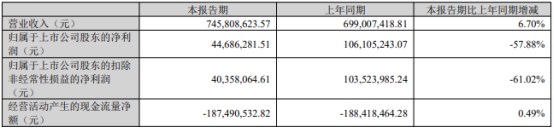 同日,中一科技发布的2023年一季度报告显示,第一季度,公司实现营业收入7.46亿元,同比增长6.70%;归属于上市公司股东的净利润4468.63万元,同比减少57.88%;归属于上市公司股东的扣除非经常性损益的净利润4035.81万元,同比减少61.02%;经营活动产生的现金流量净额-1.87亿元,同比增长0.49%。