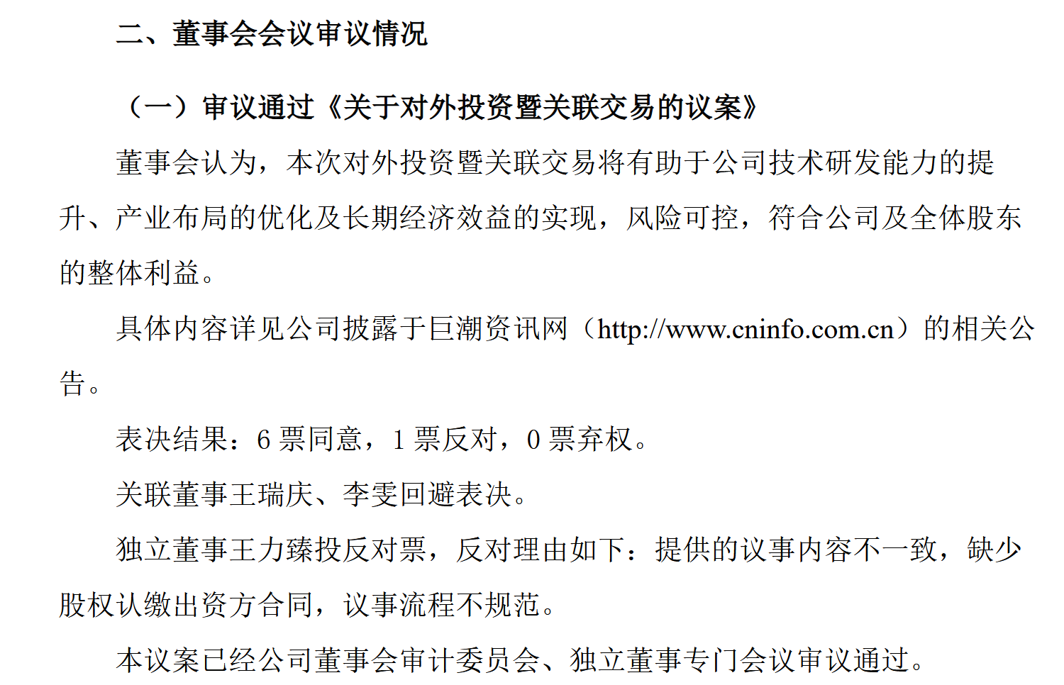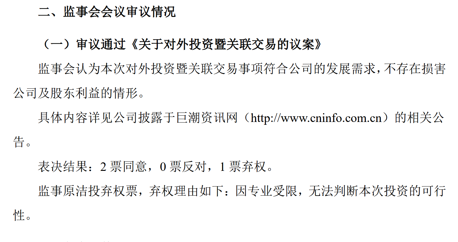 但该事项存在独立董事的反对票。公告显示,独立董事王力臻投反对票,理由涉及议事流程不规范等。监事原洁也投了弃权票,弃权理由为“因专业受限,无法判断本次投资的可行性”。
