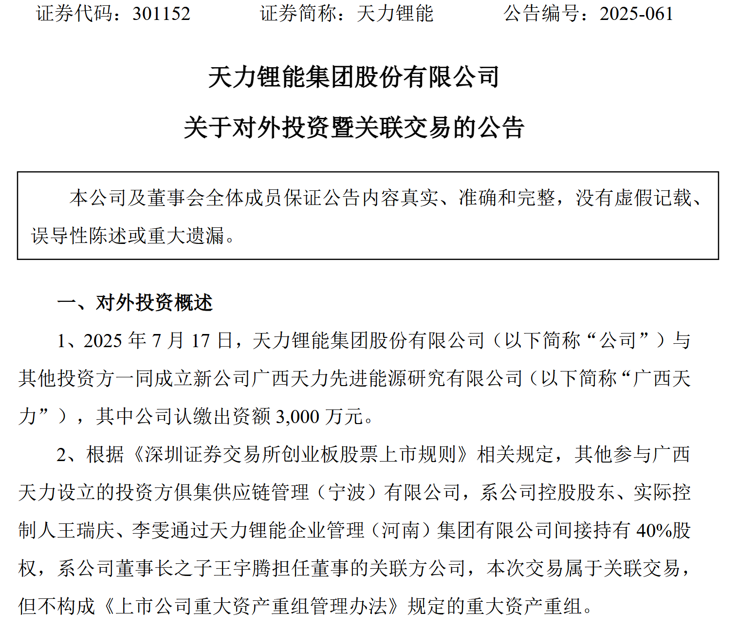 值得注意的是,参与广西天力设立的投资方俱集供应链管理(宁波)有限公司(以下简称“俱集供应链”),系天力锂能控股股东、实际控制人王瑞庆、李雯通过天力锂能企业管理(河南)集团有限公司间接持有40%股权,且天力锂能董事长王瑞庆之子王宇腾担任俱集供应链董事。根据相关规定,本次交易构成关联交易,但不构成重大资产重组。