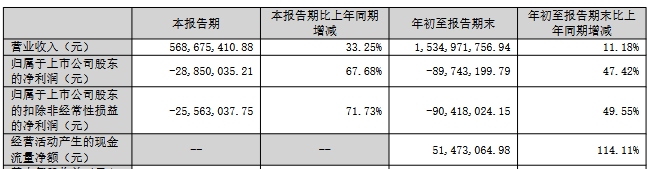 2025年1-9月,公司实现营业收入15.35亿元,同比增长11.18%;归属于上市公司股东的净利润为-8,974.32万元,上年同期为-1.71亿元;归属于上市公司股东的扣除非经常性损益的净利润为-9,041.80万元,上年同期为-1.79亿元;经营活动产生的现金流量净额为5,147.31万元,同比增长114.11%。