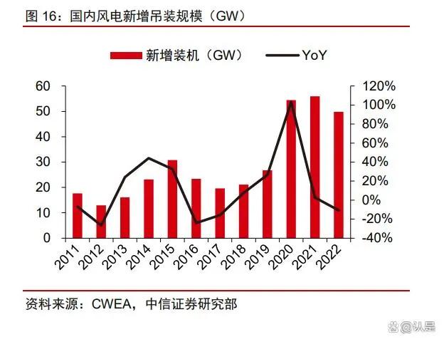 预计 2023 年风电市场将迎显著复苏,2023-25 年国内海风 CAGR 有望达 40%以上。受疫情等因素影响,2022 年国内风电装机进度有所延后,根据 CWEA 数据,全年吊装规模 49.8GW 左右,但并网规模仅 37.6GW。随着疫情影响逐步缓解,风电经济性大幅提升,以及 2022 年部分延迟项目结转,2023 年我国风电装机增长有望明显加速,预计全年整体新增装机规模将提升至 75GW 左右,其中海上风电有望增至 7-10GW,且 2023-25 年海风装机仍有望维持约 40%以上的较高 CAGR。