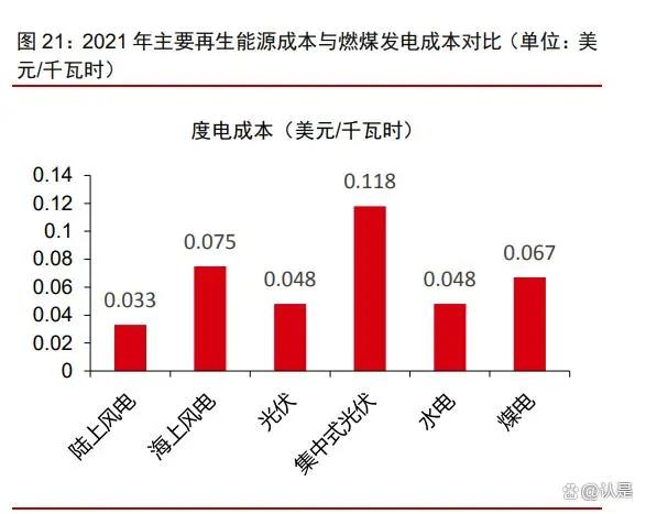 另一方面,度电成本持续下降,风电迈入平价时代,行业成长性有望增强。近年来随着产业技术进步、效率提升,新建风电项目成本不断下降。根据 IRENA 的数据,2010 至 2021 年全球陆上、海上风电度电成本分别下降 68%、60%,2021 年全球有逾 3/4 的陆上风电成本低于燃煤发电。基于此,国家发改委 2021 年 6 月 7 日发布《关于 2021 年新能源上网电价政策有关事项的通知》,规定 2021 年起中央财政对新核准陆上风电项目不再补贴,实行平价上网。2021 年新建风电项目上网电价按当地燃煤发电基准价执行,可自愿通过参与市场化交易形成上网电价。进入平价时代后,我国风电行业发展对政策依赖度下降且降本增效提速,因退补引起的周期波动有望被熨平,行业的成长性凸显。