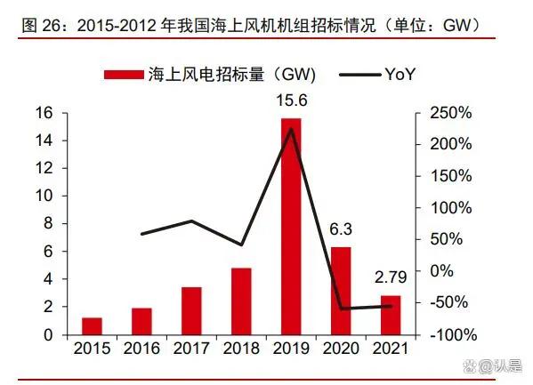 海风资源丰富,具备长期成长潜力。供给方面,相比于陆上风电,海风运行效率高、输电距离短,更适合大规模开发。而我国海岸线漫长、岛屿众多,开发资源丰富。根据中国风能协会预测,中远期我国海上风资源技术开发潜力超过 3500GW。需求方面,我国海上风能资源呈现区域性和季节性的特点,主要资源集中在东部沿海地区,尤其是福建、浙江、山东、江苏和广东五地,能够缓解当地电力供应不足问题。此外,海上风电还能够与“西电东输”形成季节互补。抢装下海风规模进一步增长,招标重启进入平价增长期。自 2020 年我国海上风电累计装机规模突破千万千瓦大关之后,由于 2021 年是新建海上风电补贴的最后一年,“抢装潮”在 2021 年进一步发展。2021 年海上风电新增投产规模达到 16.90GW,同比高增约 452.3%,超过了全球其他任何国家 5 年的装机总量。与此同时,招标需求在经历过补贴退坡的调整后,有望触底回升。