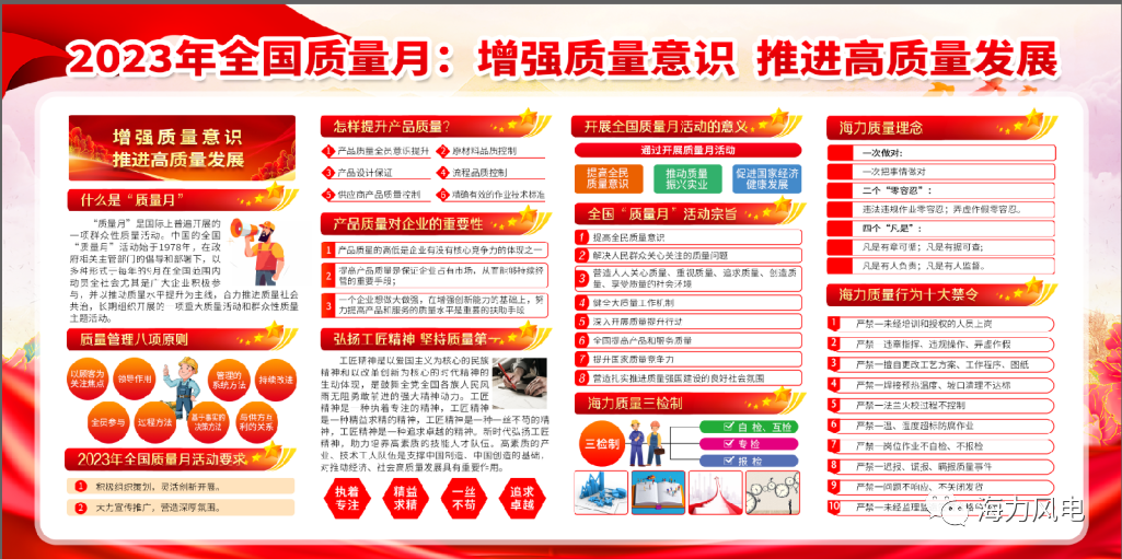 以习近平新时代中国特色社会主义思想为指导,深入贯彻落实《中共中央国务院关于开展质量提升行动的指导意见》,海力牢固树立强烈质量意识,筑牢公司质量底线,严控质量风险,将海力风电打造具有行业竞争力的科技型、管理型、质量型国内一流企业。