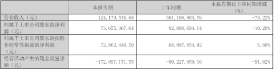 2024年一季度报告显示,今年第一季度,公司实现营业收入1.24亿元,同比减少75.22%;归属于上市公司股东的净利润7365.54万元,同比减少10.28%;归属于上市公司股东的扣除非经常性损益的净利润7286.24万元,同比增长5.60%;经营活动产生的现金流量净额-1.73亿元,上年同期为-9022.80万元。