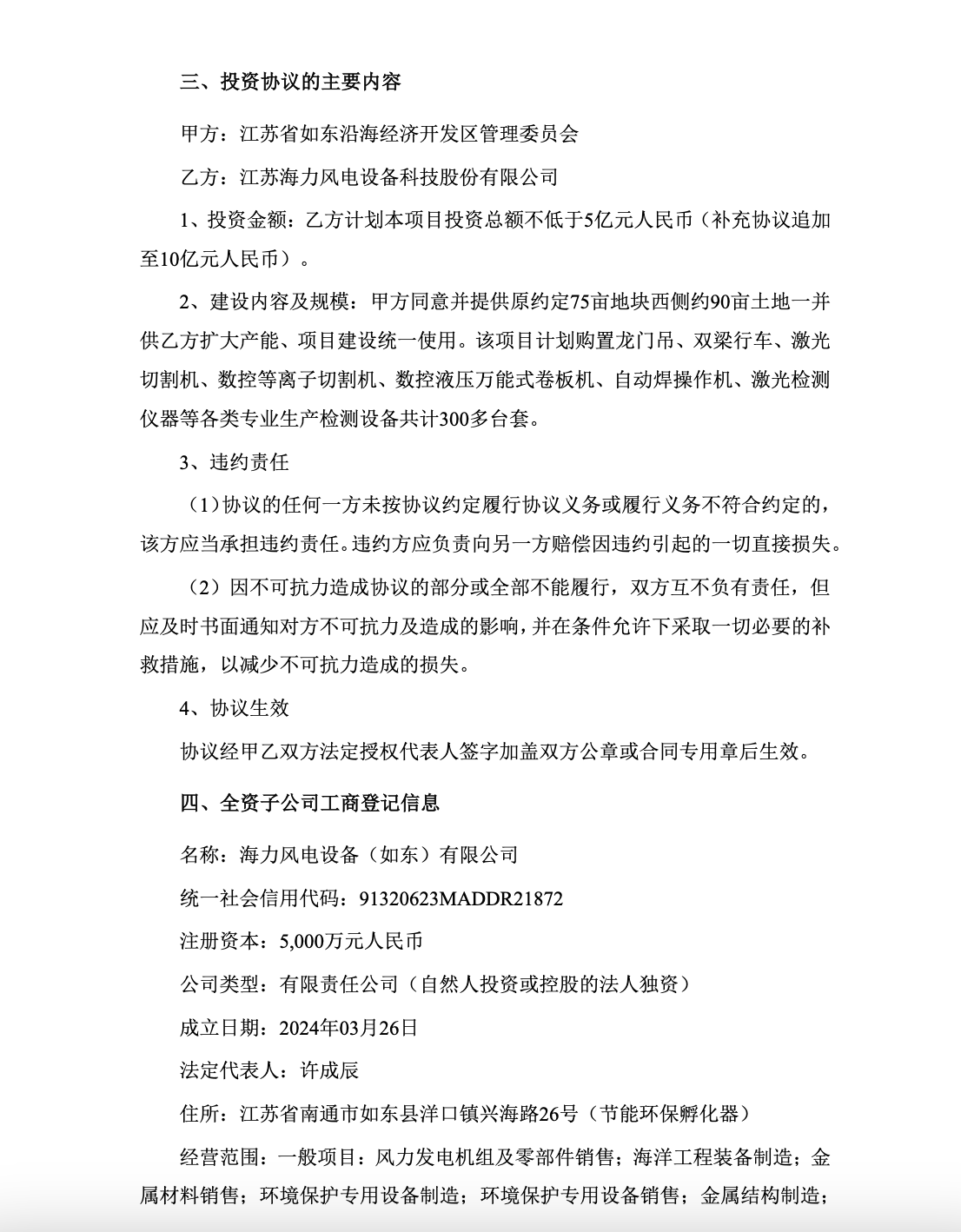 《公告》显示,海力风电和江苏省如东沿海经济开发区管理委员会签署《补充协议书》,经双方友好协商,就《项目建设协议书》的未尽事宜达成补充协议:江苏省如东沿海经济开发区管理委员会同意并提供原约定75亩地块西侧约90亩土地一并供海力风电扩大产能、项目建设统一使用;海力风电同意将项目总投资由5亿元人民币提升至10亿元人民币。