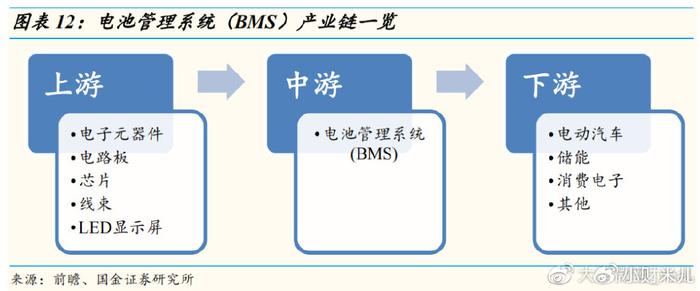 BMS全称为电池管理系统,被誉为储能/动力电池的“大脑”,是电池PACK正常运行的保障。电池包由若干电芯组成,其运作要求电芯的高度一致性。但电芯在实际运行中往往出现偏差,因此需通过BMS动态监控参数,评估各单体电池的状态,智能化管理以保持最佳状态,从而延长电池包的寿命,提高电池使用的安全性。BMS上游为硬件电路供应商,下游主要应用于电动汽车、储能和消费电子等。