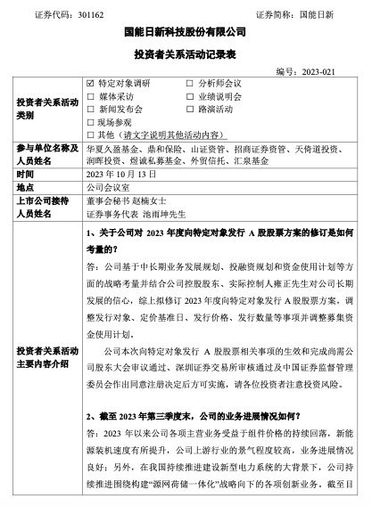 投资者询问,关于公司对2023年度向特定对象发行A股股票方案的修订是如何考量的?国能日新答复:公司基于中长期业务发展规划、投融资规划和资金使用计划等方面的战略考量并结合公司控股股东、实际控制人雍正先生对公司长期发展的信心,综上拟修订2023年度向特定对象发行A股股票方案,调整发行对象、定价基准日、发行价格、发行数量等事项并调整募集资金使用计划。