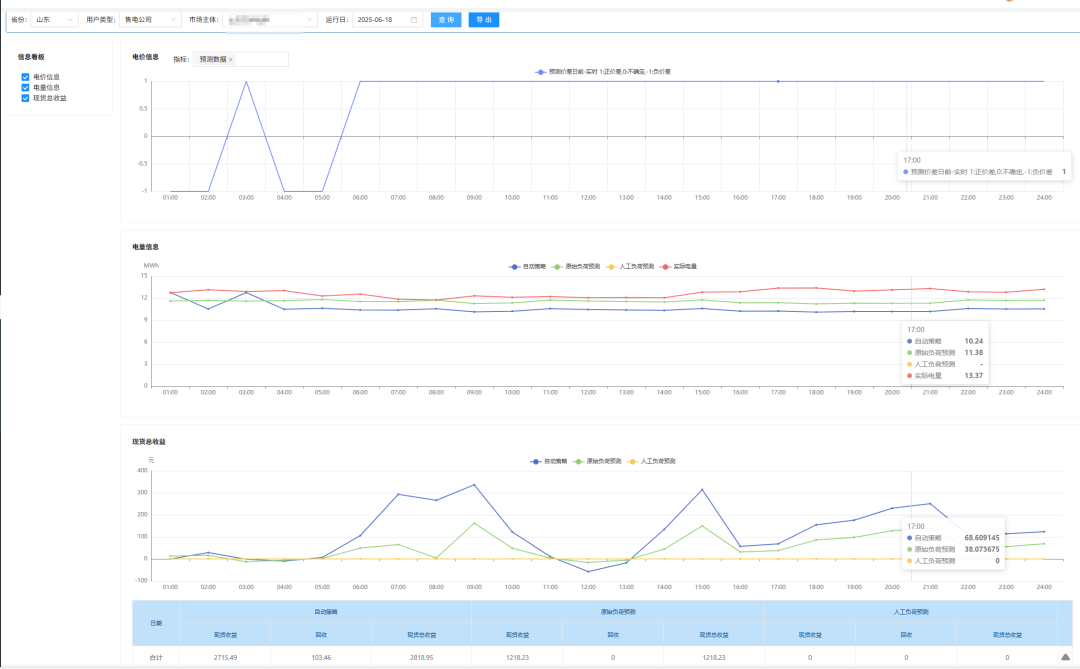 当预测日前电价高于中长期电价时,立即触发买入指令,智能研判买入策略。系统基于国能日新先进的价格预测模型与市场趋势分析算法,对海量历史交易数据、实时供需信息、新能源发电出力等多维数据进行深度学习与动态分析,精准锁定日滚动市场中的低价电量,帮助售电公司提前储备电力资源,高效填补现货高价时段的用电需求缺口,降低综合采购成本;当预测日前电价低于中长期电价时,迅速启动卖出策略,提前锁定价差收益。系统依托智能分析算法,对售电公司持有的中长期合约电量进行精细化评估,识别冗余电量,结合市场价格波动规律与走势预判,指导售电公司在日滚动市场高位抛售冗余电量,将价差收益提前落袋为安,实现收益最大化。进一步,通过浮赢核算体系,综合考量撮合交易收益,以及放弃当前撮合转而参与月度或年度集中竞价的潜在收益,帮助售电公司全面评估交易价值,为决策提供科学依据,实现收益与风险平衡。