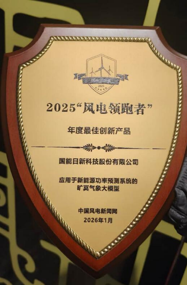 十四五”收官在即,全国风电累计并网容量即将突破 6 亿千瓦。在此行业发展新机遇下,中国风电新闻网于 2026 年 1 月 8 日在北京举办了 2025(第五届)“风电领跑者”技术创新论坛暨颁奖盛典,作为 2025(第五届)“风电领跑者”评选活动的核心环节,本次论坛现场完成了年度奖项的揭晓与颁发。国能日新科技股份有限公司自主研发的应用于“新能源功率预测系统的旷冥气象大模型,凭借在AI+风电领域的技术突破性与产业增效价值,成功斩获“2025‘风电领跑者’年度最佳创新产品”奖项。此次获奖,既是行业对其技术实力的高度认可,也彰显了 AI 技术在风电市场化运营领域的核心赋能价值。