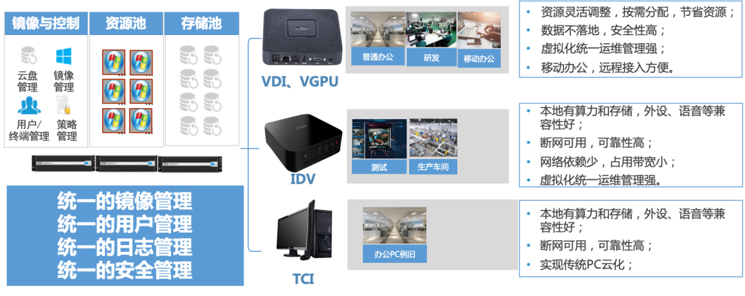 采用场景化云桌面方案,TCI+IDV+VDI架构对办公环境进行转型升级,TCI对已有PC进行统一纳管,IDV对新增设备进行快捷部署和便捷运维,VDI针对数据安全和移动办公进行有效管控,三位一体,三擎融合满足不同场景的需要。