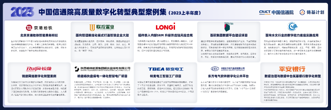 7月27日,由中国信通院主办的“2023数字生态发展大会”暨中国信通院“铸基计划”年中会议在京召开,大会总结“铸基计划”上半年工作成果,解析数字化转型发展趋势,并重磅发布了《2023高质量数字化转型典型案例集(2023上半年)》。
