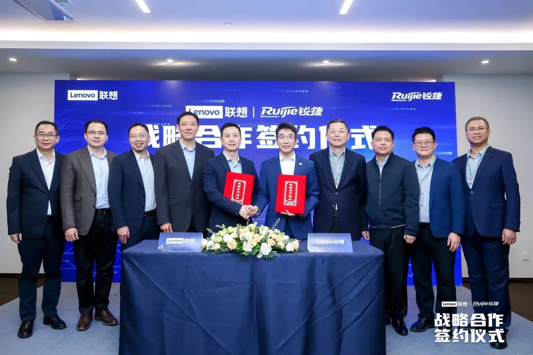 联想集团执行副总裁兼中国区总裁刘军,联想集团副总裁、中国区战略及业务拓展副总裁阿木,联想集团副总裁、联想中国政企业务群总经理王立平,联想集团副总裁、联想中国基础设施业务群总经理陈振宽,锐捷网络总经理刘忠东,锐捷网络副总经理黄育辉,锐捷网络企业级网络事业群副总经理张毅,锐捷网络企业级网络事业群渠道客户系统部总经理王刚等见证签约。联想中国基础设施业务群网络事业部总经理、边缘计算事业部总经理杨春,锐捷网络战略合作部总经理唐超,代表双方签署了战略合作协议。