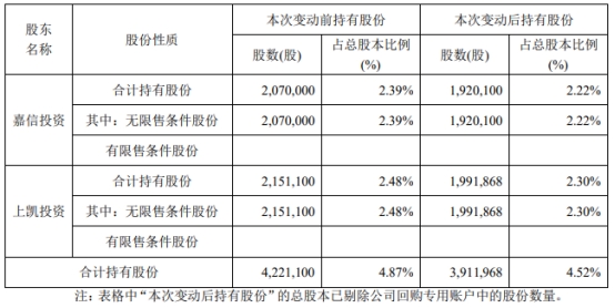本次变动后,嘉信投资和上凯投资合计持有优宁维股份3,911,968股,占优宁维总股本比例的4.52%。