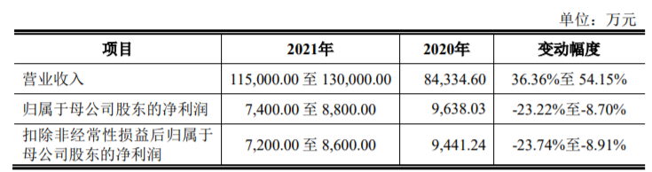 公司预计2021年实现营业收入115,000.00万元至130,000.00万元,同比增长36.36%至54.15%;预计归属于母公司股东的净利润为7400.00万元至8800.00万元,同比下降23.22%至8.70%;预计扣除非经常性损益后归属于母公司股东的净利润为7200.00万元至8600.00万元,同比下降23.74%至8.91%。