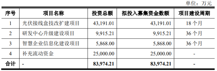 通灵股份本次发行新股募集资金总额为11.72亿元,扣除发行费用后,实际募集资金净额为10.58亿元。通灵股份最终募集资金净额比原计划多2.18亿元。通灵股份于2021年12月6日披露的招股说明书显示,公司拟募集资金8.40亿元,分别用于光伏接线盒技改扩建项目、研发中心升级建设项目、智慧企业信息化建设项目、补充流动资金。