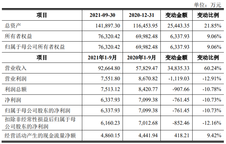 2021 年 1-9 月,公司实现营业收入 92,664.80 万元,较上年同期增长 60.24%;归属于母公司股东的净利润为6337.93万元,同比降低10.73%;扣除非经常性损益后归属于母公司股东的净利润 6160.23 万元,同比降低 12.16%;经营活动产生的现金流量净额为4860.15万元,同比增长9.42%。