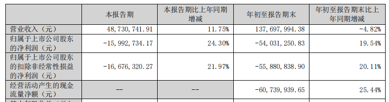 零点有数(301169.SZ)2025年三季度报告显示,2025年前三季,公司实现营业收入1.38亿元,同比下降4.82%;归属于上市公司股东的净利润-5403.13万元,同比增长19.54%;归属于上市公司股东的扣除非经常性损益的净利润-5588.08万元,同比增长20.11%;经营活动产生的现金流量净额为-6073.99万元,同比增长25.44%。