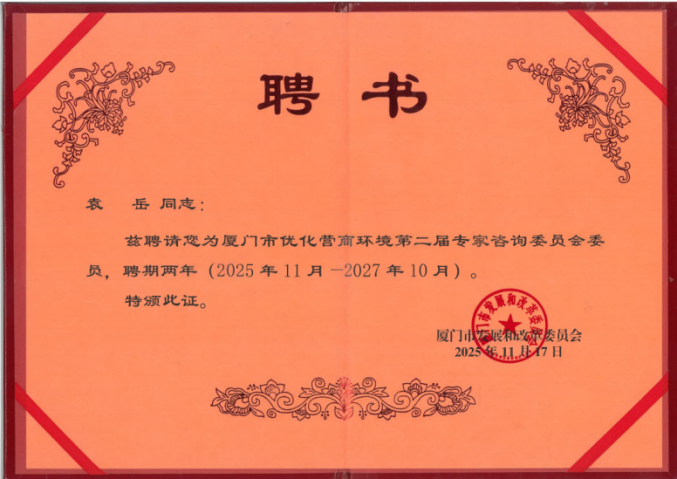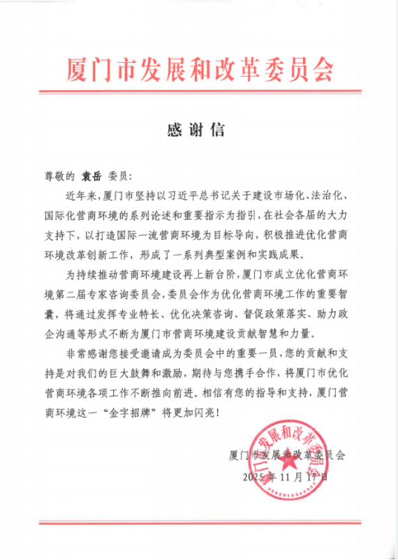 日前,零点有数收到厦门市发展和改革委员会发来的感谢信,信中表达了对零点有数董事长袁岳博士支持厦门营商环境建设工作的诚挚谢意。袁岳董事长也已正式受聘为“厦门市优化营商环境第二届专家咨询委员会”委员,聘期两年。