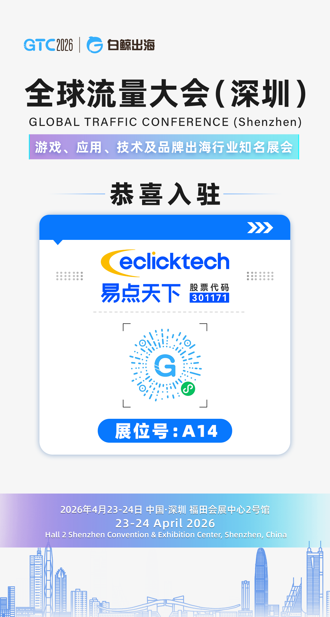 将亮相【A14】展位,围绕游戏、AI、应用等重点赛道,带来更具实操价值的出海增长解决方案。展会期间,现场还将提供出海营销咨询、行业案例分享及互动福利,助力参会伙伴更直观地了解全球增长新路径。