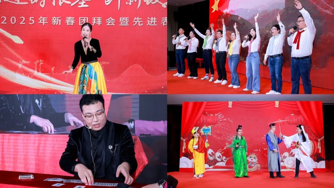团拜会上,员工们用自编自导自演的节目庆祝新年。《中科集团2024年度大事记》带领全体员工重温了公司2024年努力奋斗成果。歌舞《上春山》充满美好与生机;三句半《银蛇贺岁,中科新篇》和小品《打工原始人》高潮迭起、掌声雷动;实力唱将倾情献唱,《这世界有那么多人》《神仙挡不住人想人》《玛依拉变奏曲》《明天会更好》《不放弃》,动人心弦;激情澎湃的诗歌朗诵《中科环保是我们的骄傲》和创意十足的弹唱《对面的女孩看过来》展现出中科人的自信从容。穿插其中的游戏为整场活动增添了无限欢乐。魔术表演《或然率为零》让大家在欢笑中体验了一场别开生面的“惊喜”之旅;充满张力的歌舞《悟空》展现了中科人的坚韧与不屈;创意十足的手指舞《快乐小矮人》笑声不断;青春与活力的《小熊狂舞》燃爆全场;大合唱《祖国不会忘记》抒发了中科人的奋斗精神。