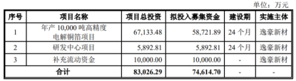 逸豪新材实际募资净额比原拟募资多15,729.86万元。根据逸豪新材9月23日披露的招股说明书显示,公司拟募资74,614.70万元,分别用于年产10,000吨高精度电解铜箔项目、研发中心项目、补充流动资金。