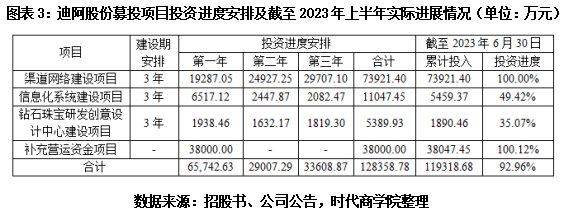 但从实际情况来看,公告显示,截至2023年6月30日,迪阿股份募投项目中的渠道网络建设项目投资进度为100%;信息化系统建设项目、钻石珠宝研发创意设计中心建设项目投资进度分别为49.42%、35.07%。