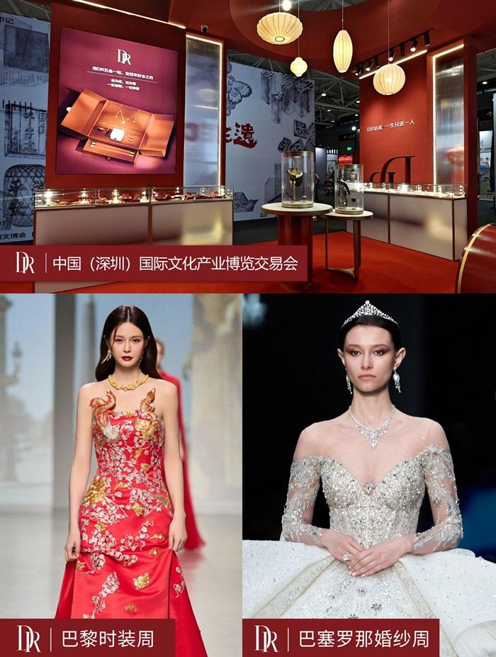 2024年3月,DR携手知名华裔设计师Vivienne Tam以东方传统文化中的龙凤为设计灵感,推出DRAGON系列和KING & QUEEN系列,于巴黎时装周大秀上重磅发布。法国国宝级影后朱丽叶?比诺什(Juliette Binoche)、中国知名歌手莫文蔚、知名媒体人杨澜等众多演艺界与文化界代表出席。同年4月,DR携手意大利顶奢高级定制婚纱品牌Corona Borealis,登上巴塞罗那婚纱周,于顶级世界舞台,呈现一场关于高级婚嫁珠宝与华服的视觉盛宴;5月,DR应邀参加第二十届中国(深圳)国际文化产业博览交易会,延续巴黎时装周“婚嫁文化”主题,于国际性的文化产业博览交易会上,向全世界展现爱与东方婚嫁的力量。