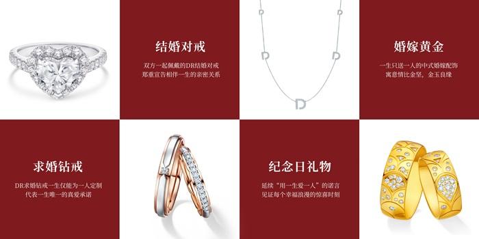 消费需求多样化的时代,铸造屹立不倒的品牌传奇,必然离不开完善的作品矩阵。DR最初以求婚钻戒被人所熟知,在这个领域DR也做到了极致,于23年荣获了“全球第一钻戒品牌”*的美誉。但对DR而言,其作品不只是“钻石”,而是围绕“终生爱的表达”的一系列作品,因此,DR的作品矩阵除求婚钻戒外,还覆盖结婚对戒、纪念日礼物和婚嫁黄金。
