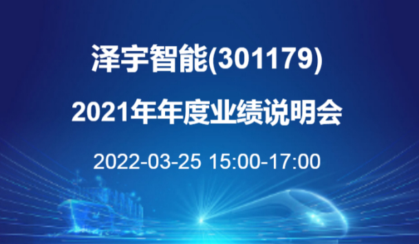 泽宇智能(301179)2021年度业绩网上说明会于2022年3月25日(星期五)15:00至17:00在全景路演成功举办。